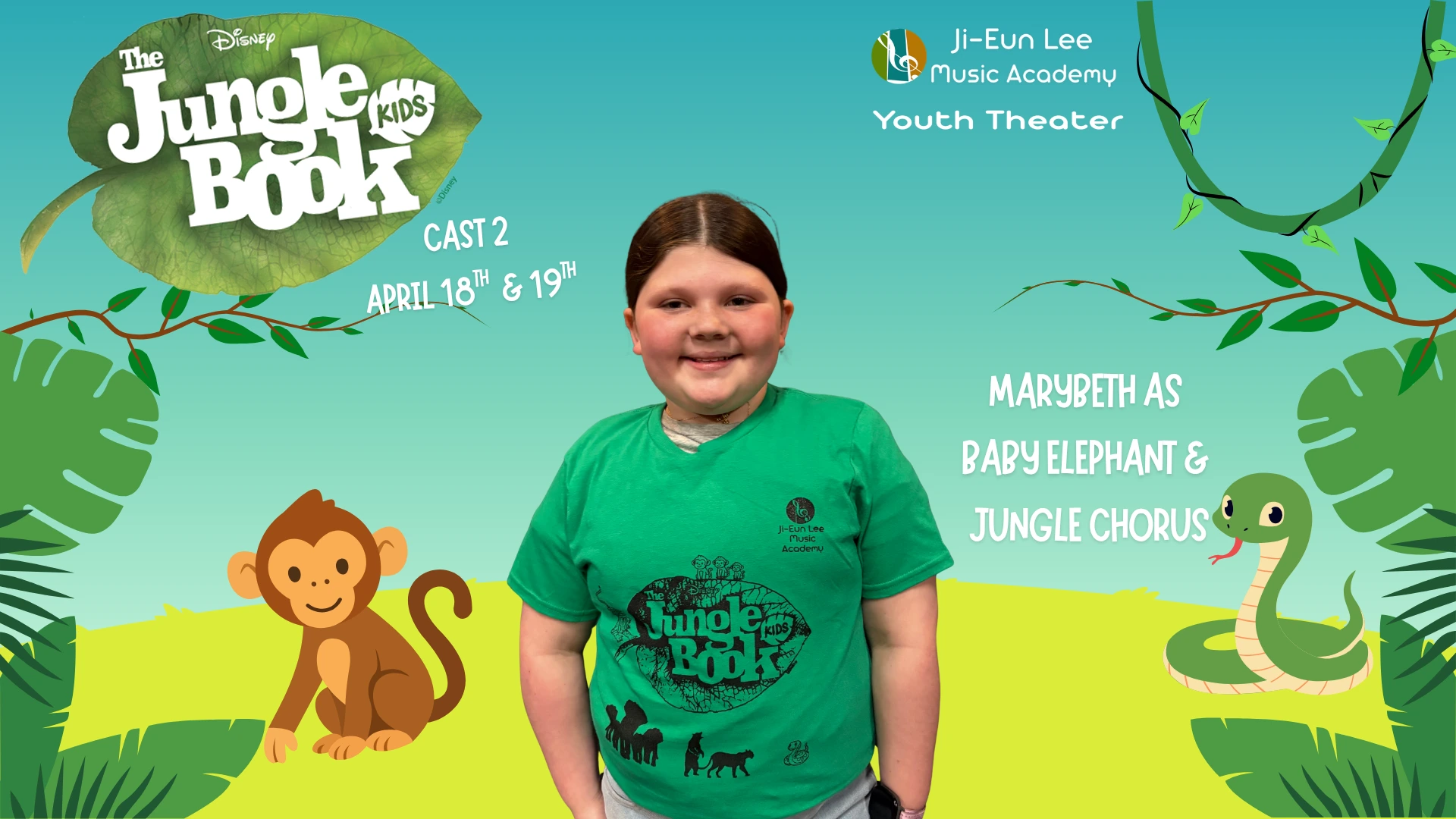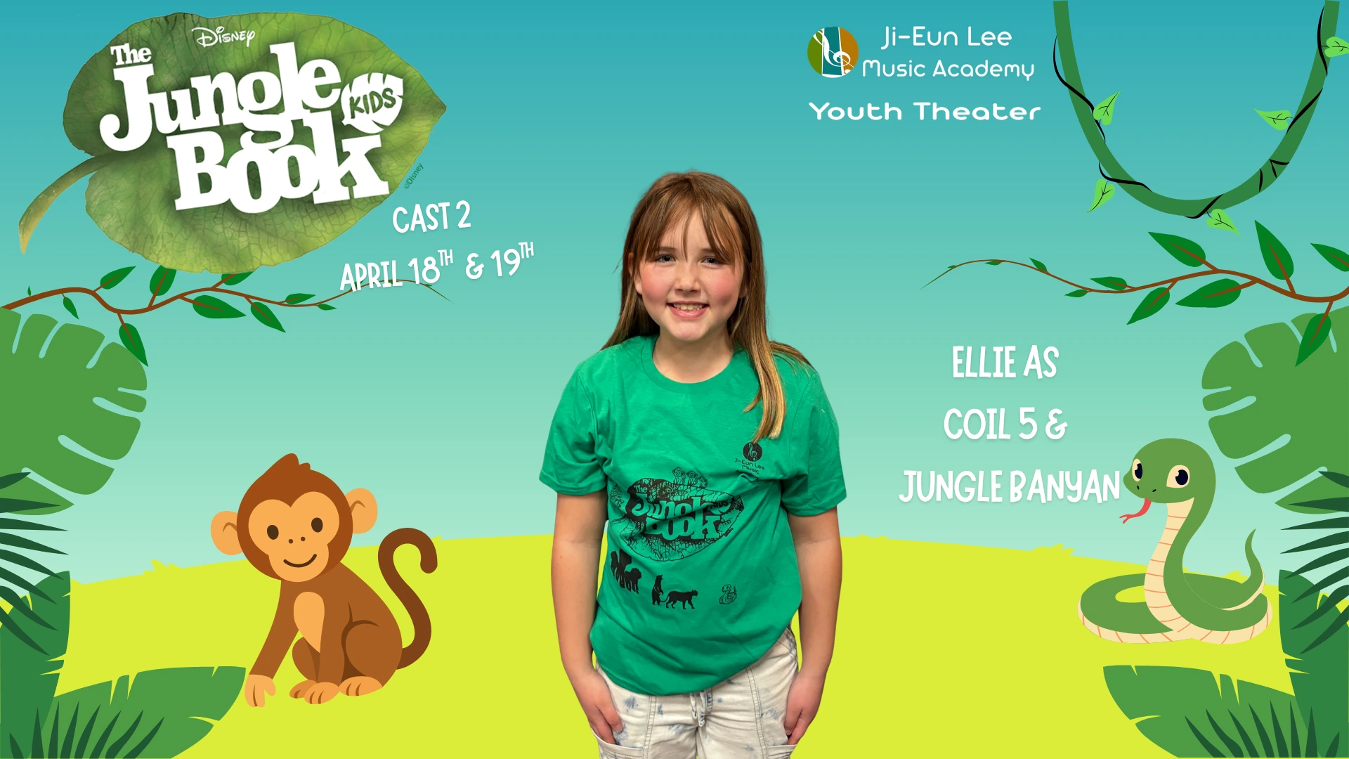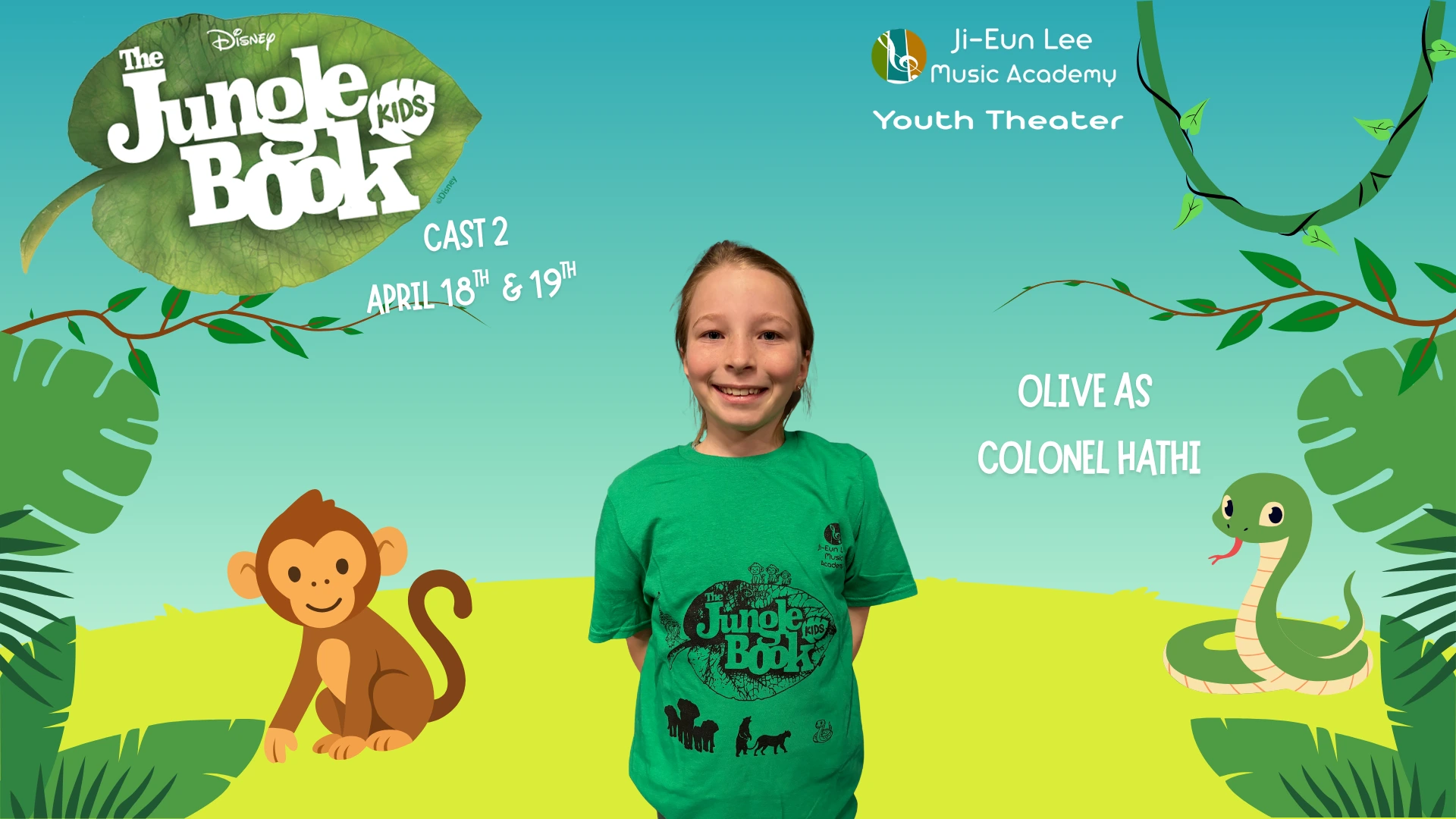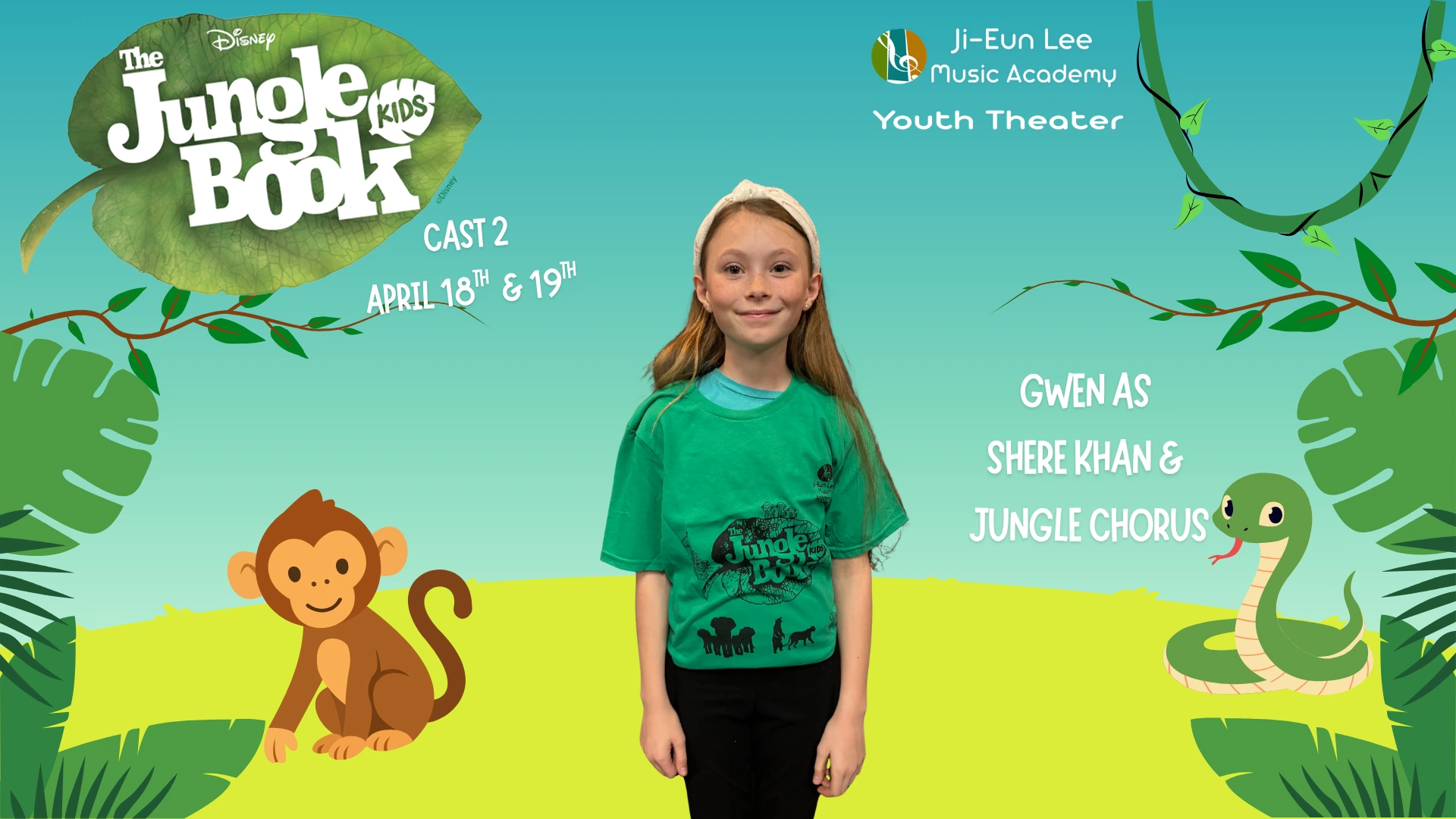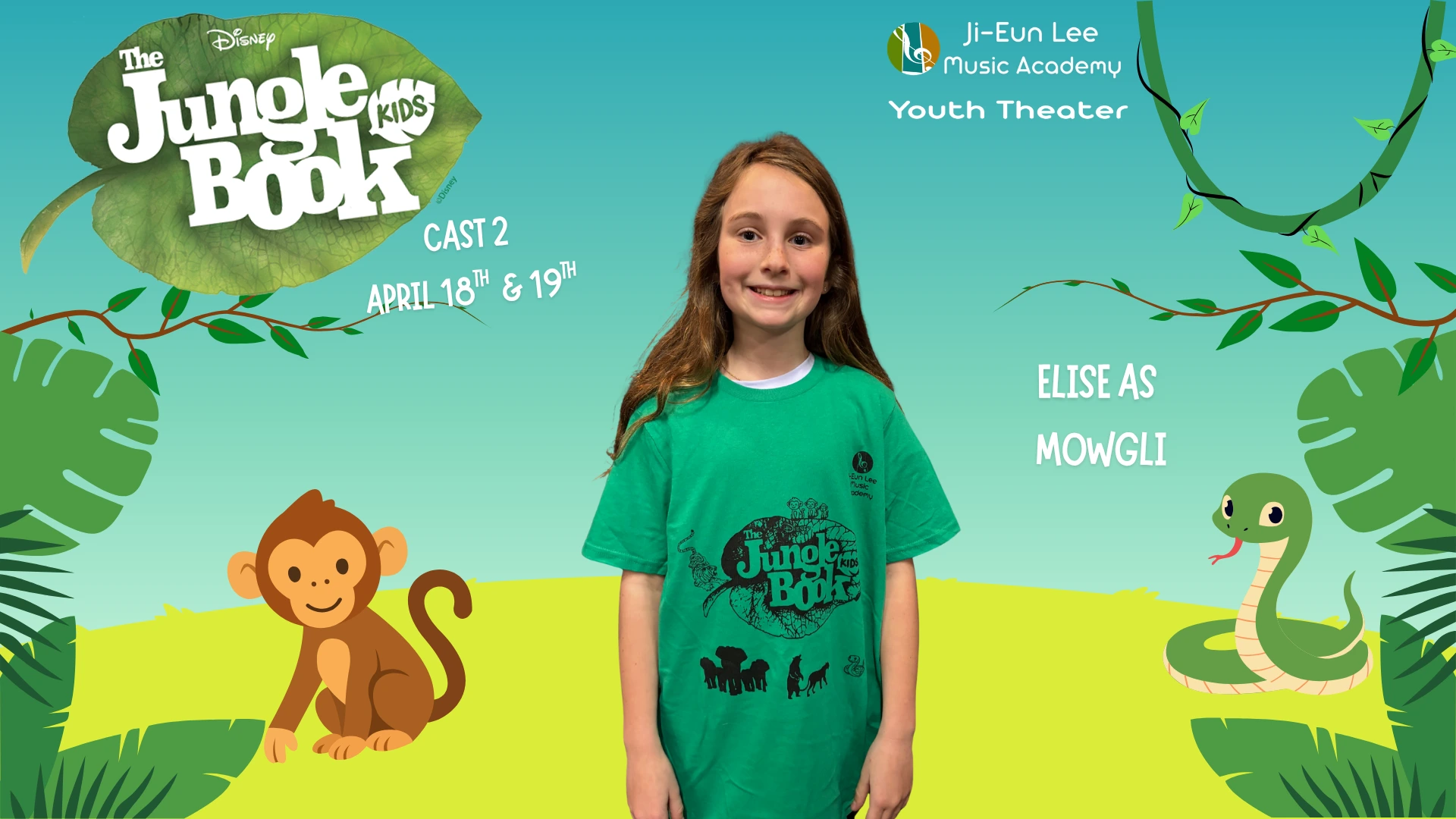 Elise is in 4th grade, and this is her 5th show which has included Aladdin, Little Mermaid, Aristocats, Music Man, Shrek and of course currently Jungle Book. When Elise isn’t singing, she is killing it on the soccer field and flipping at gymnastics. Break a leg