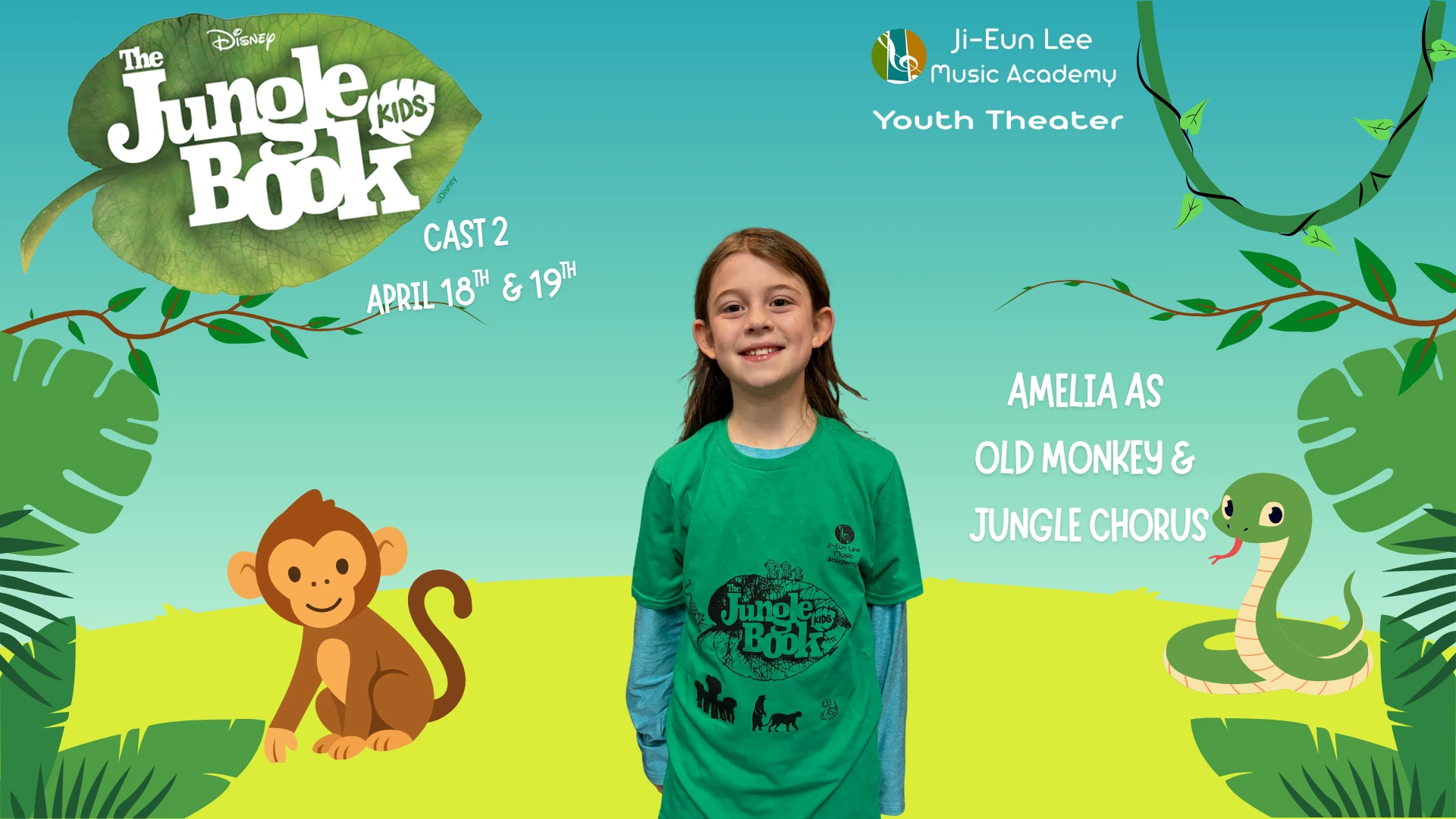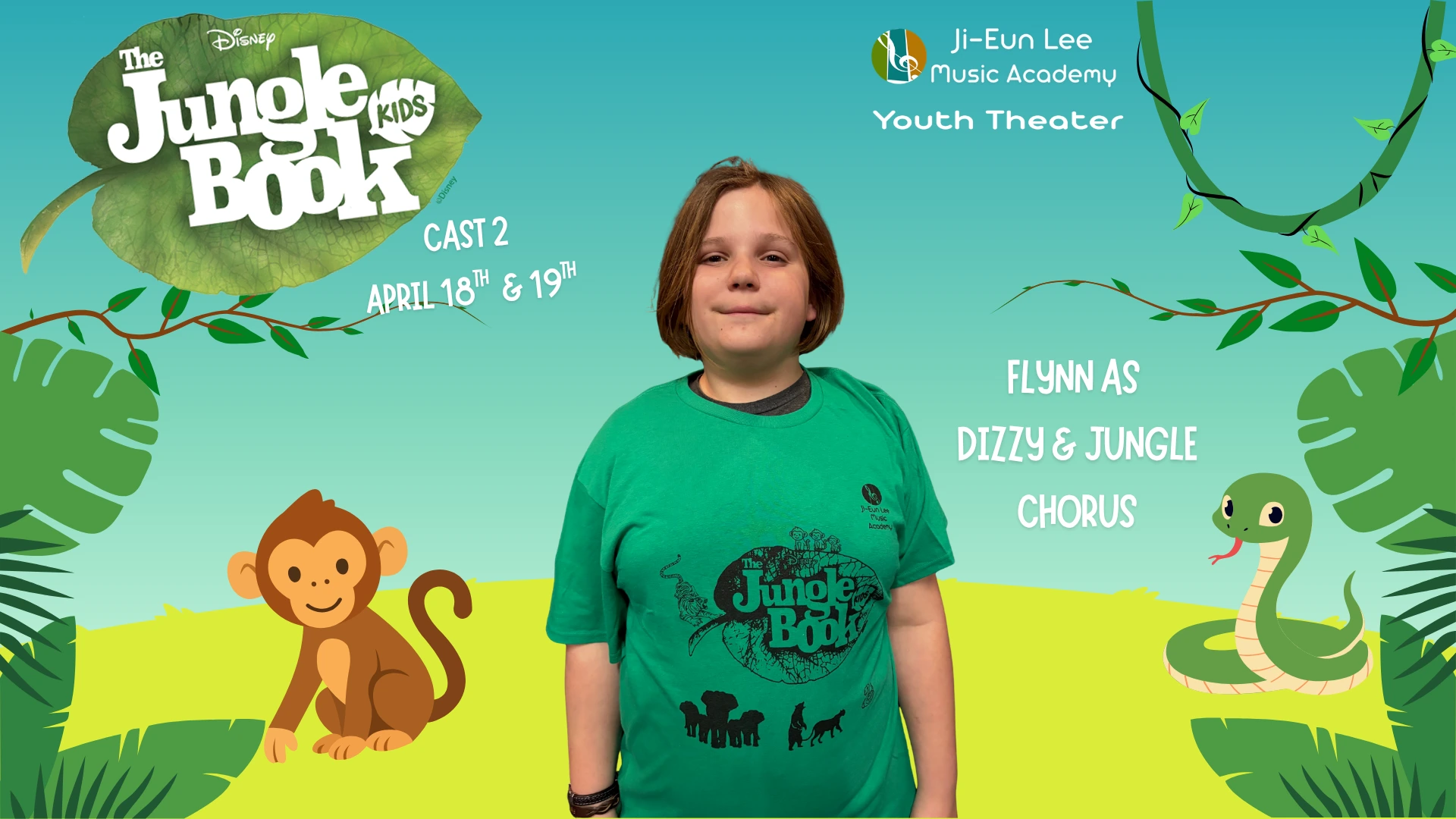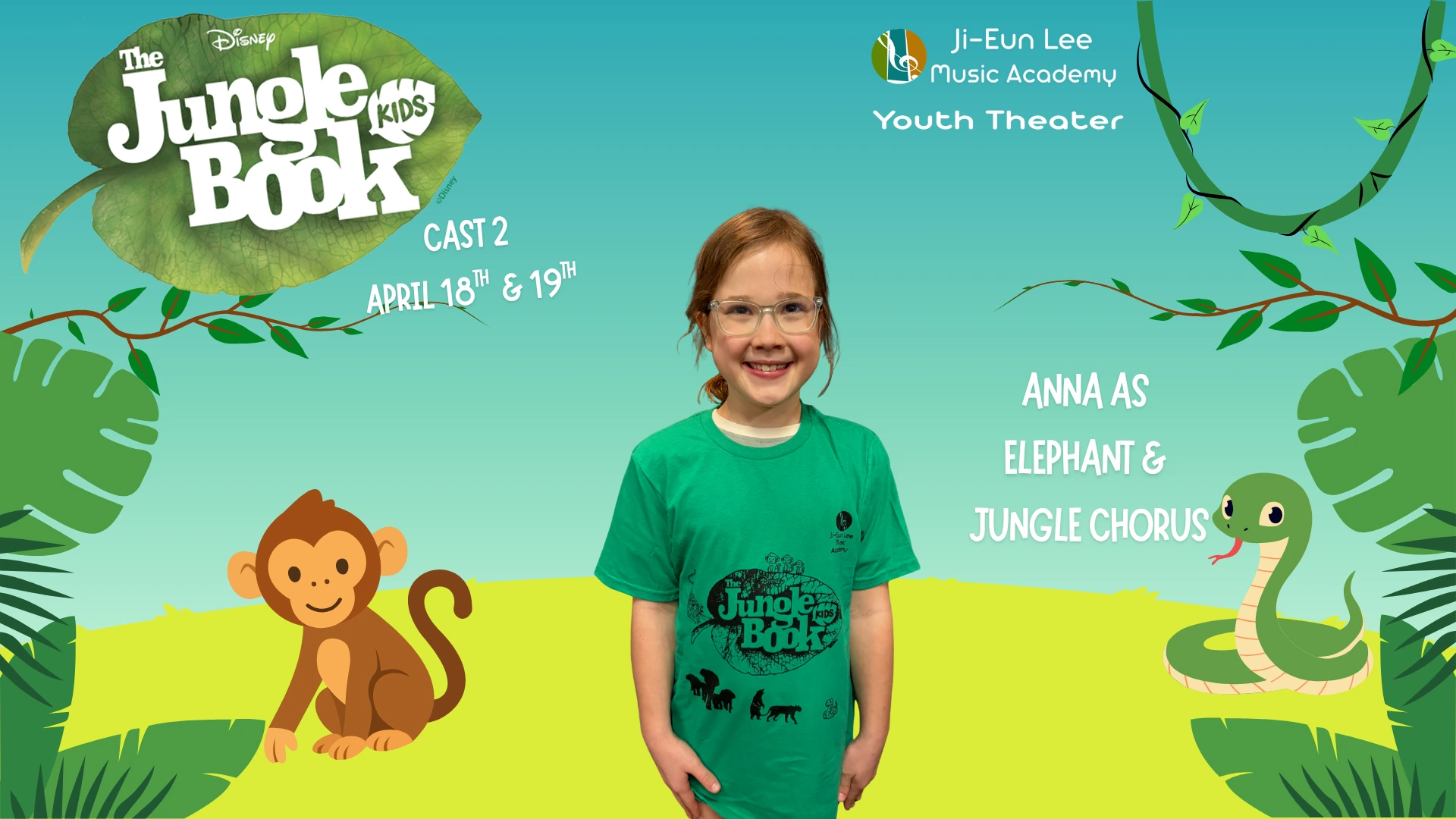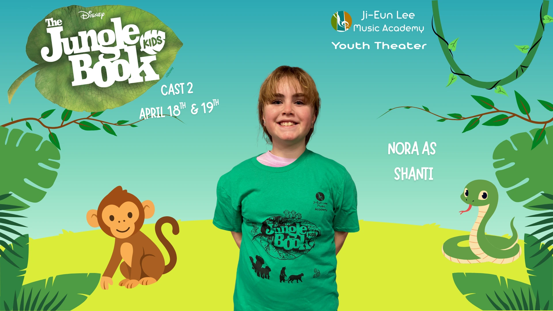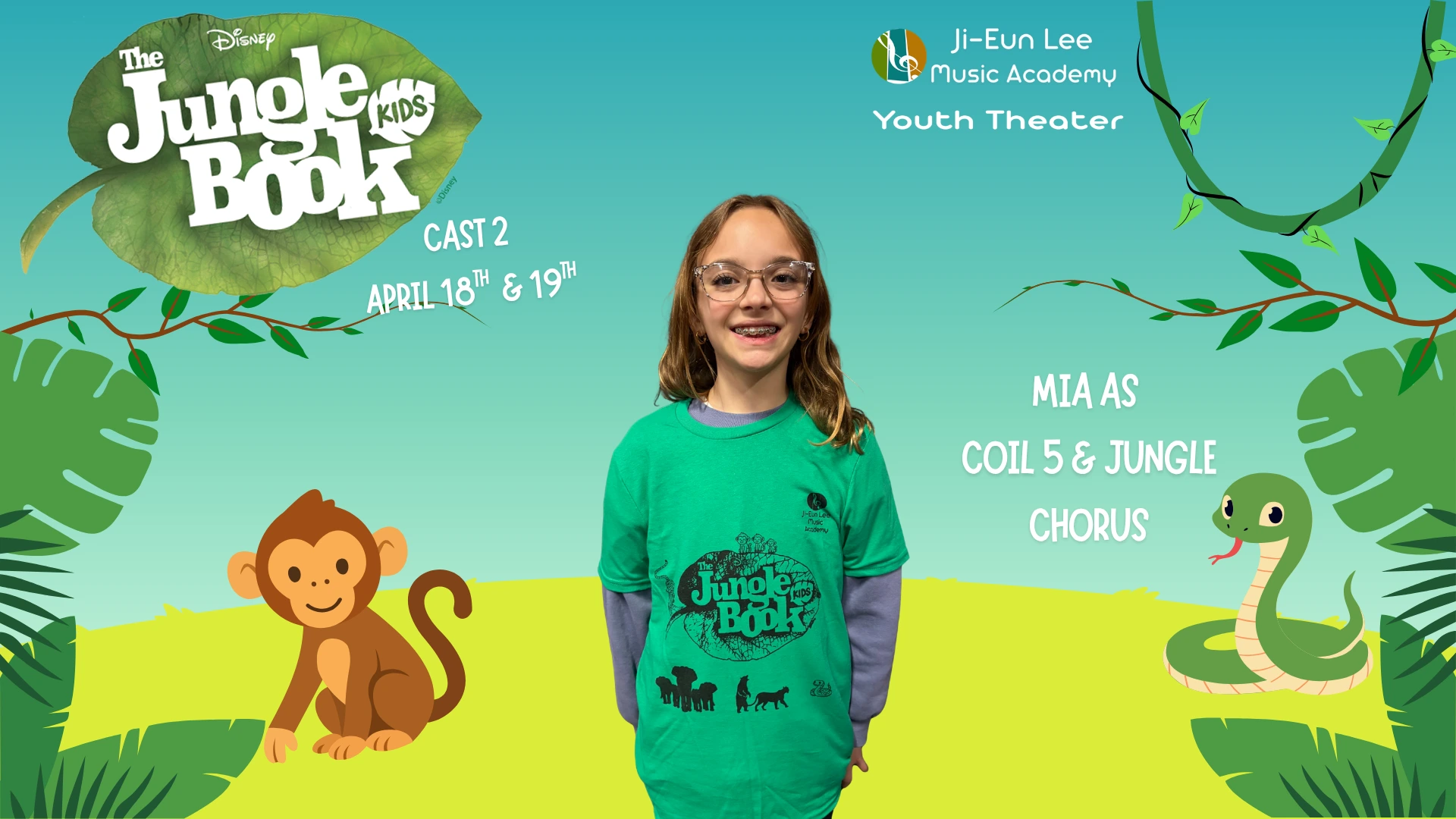 Elise is in 4th grade, and this is her 5th show which has included Aladdin, Little Mermaid, Aristocats, Music Man, Shrek and of course currently Jungle Book. When Elise isn’t singing, she is killing it on the soccer field and flipping at gymnastics. Break a leg
