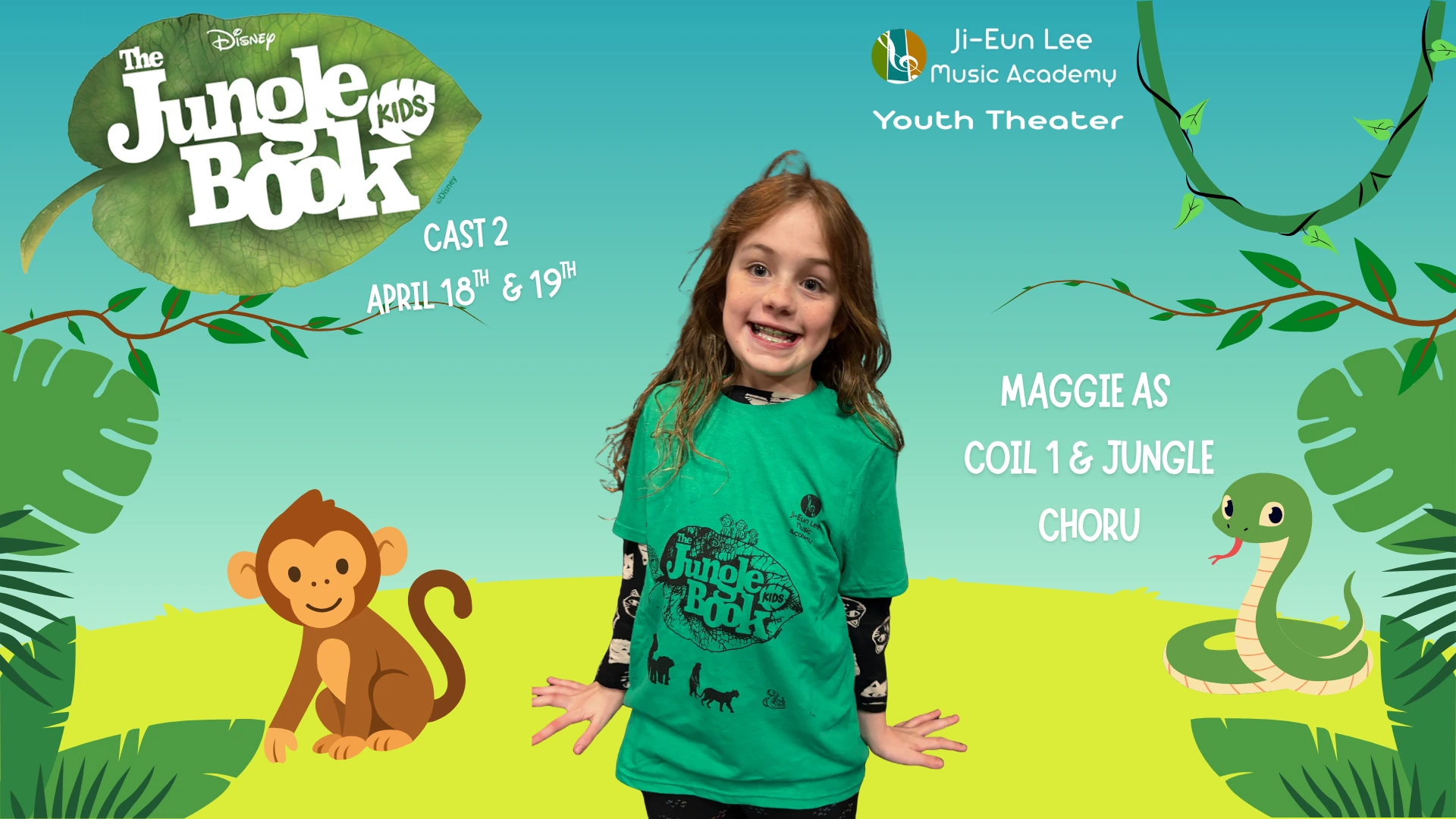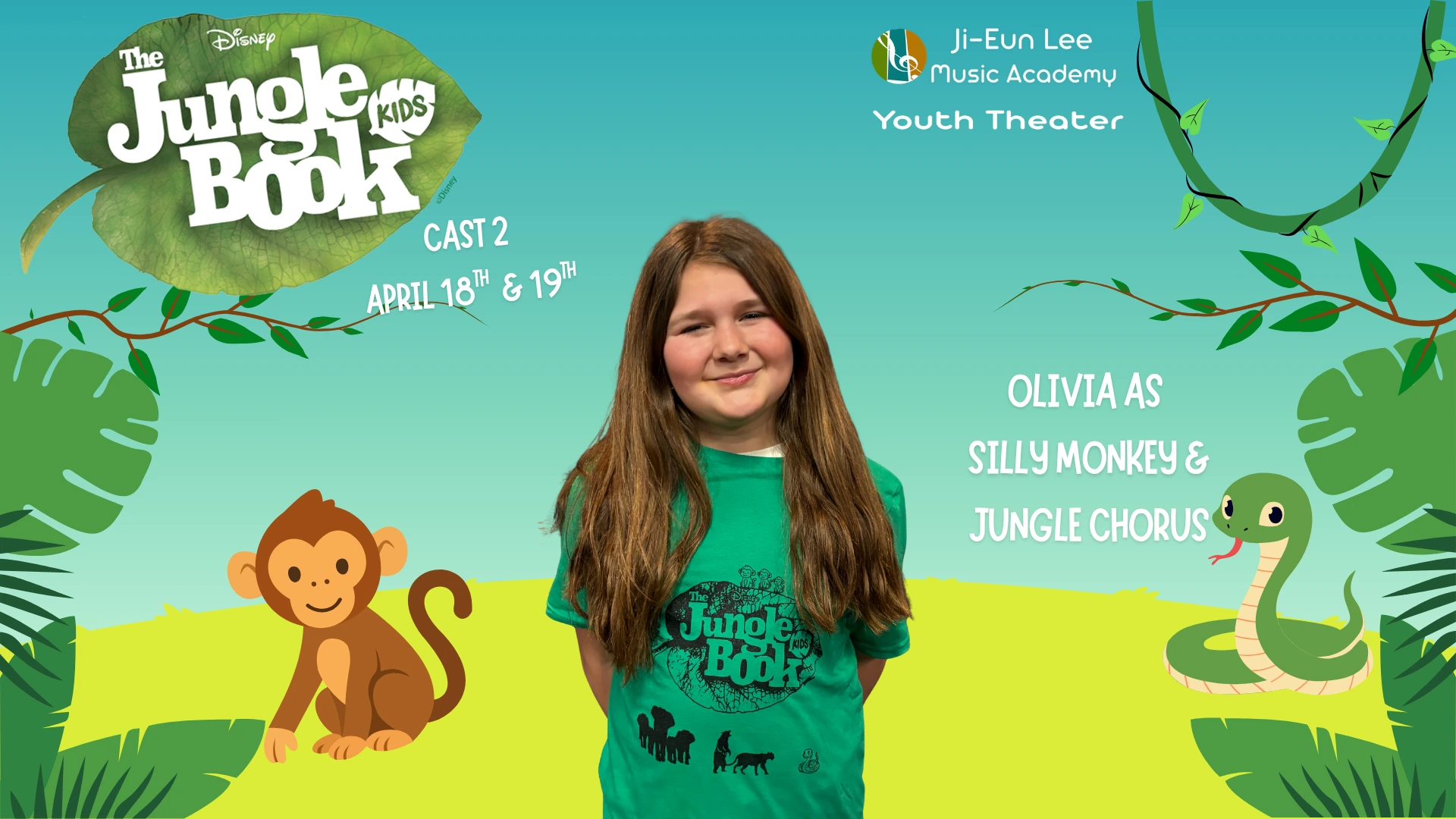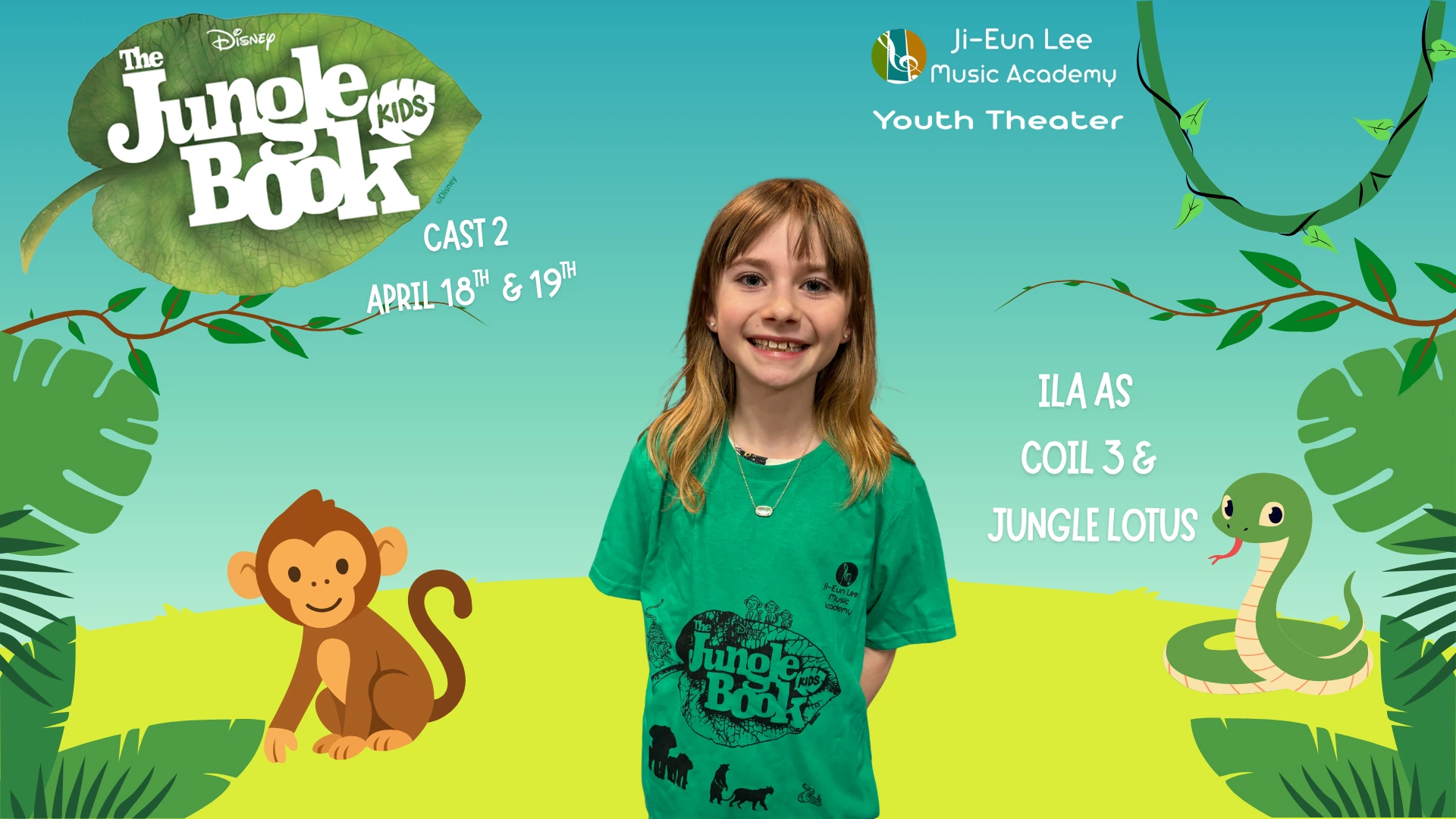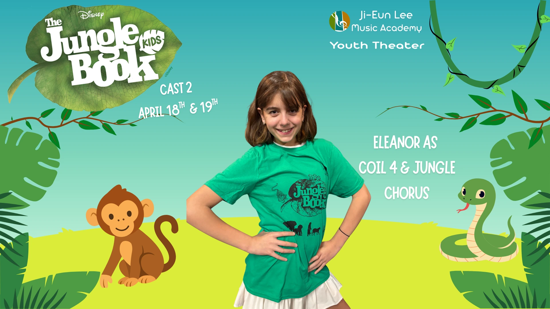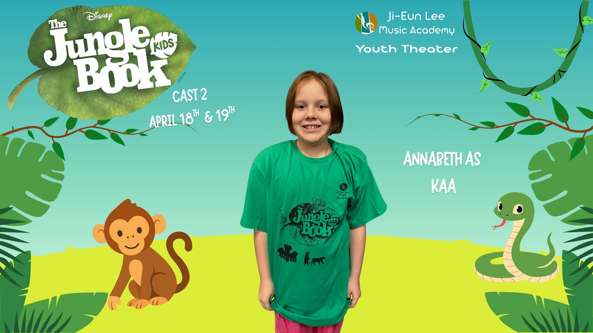 Elise is in 4th grade, and this is her 5th show which has included Aladdin, Little Mermaid, Aristocats, Music Man, Shrek and of course currently Jungle Book. When Elise isn’t singing, she is killing it on the soccer field and flipping at gymnastics. Break a leg