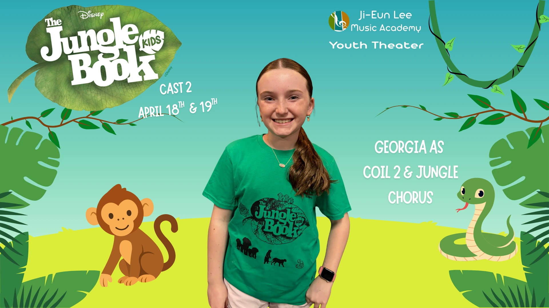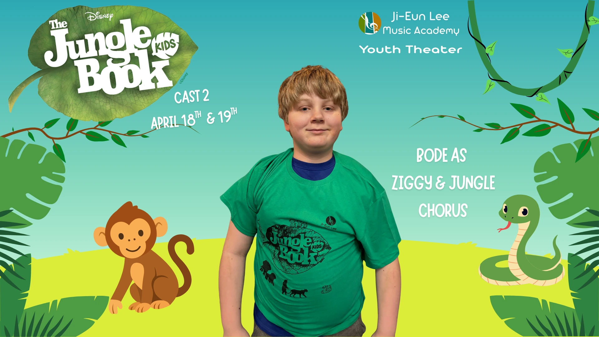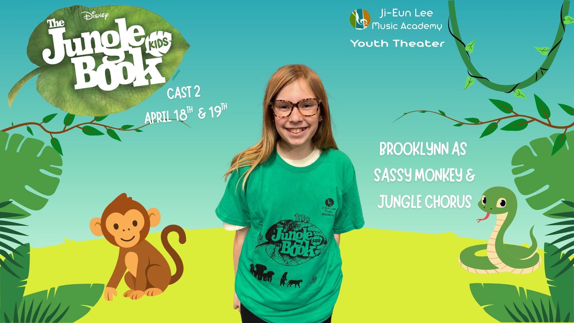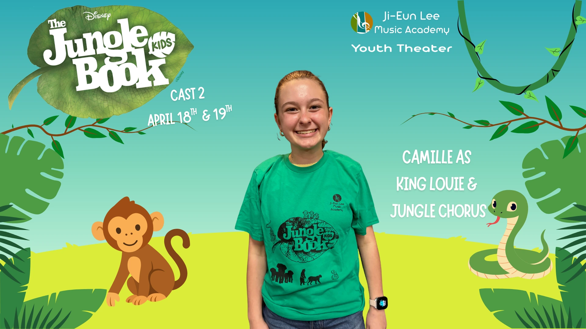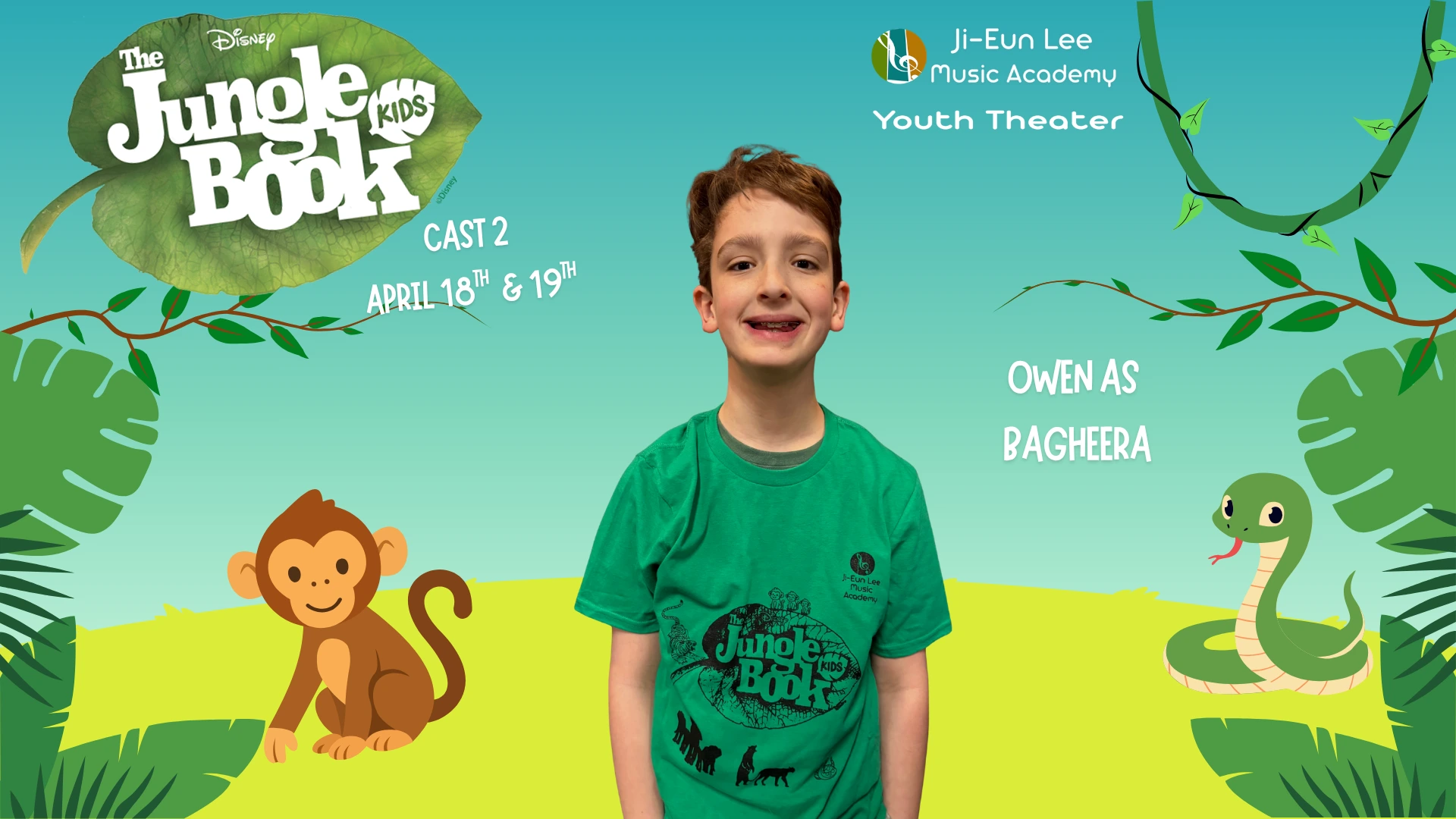 Elise is in 4th grade, and this is her 5th show which has included Aladdin, Little Mermaid, Aristocats, Music Man, Shrek and of course currently Jungle Book. When Elise isn’t singing, she is killing it on the soccer field and flipping at gymnastics. Break a leg